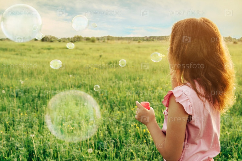 Девочка играет с мыльными пузырями летом