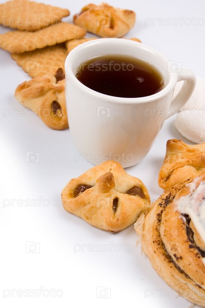 Чашка чая с печеньем на белом фоне