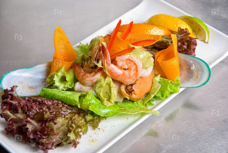 Морепродукты с фруктами и зеленью на тарелке