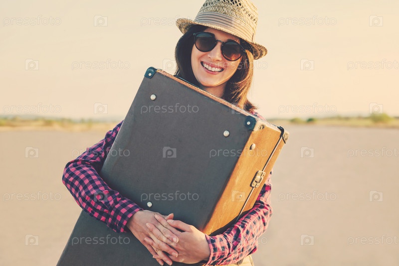 Счастливая женщина, обнимая чемодан