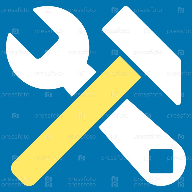 Молоток и растровых инструментов. Стиль является биколор плоский символ, желтого и белого цвета, закругленные углы, синий фон