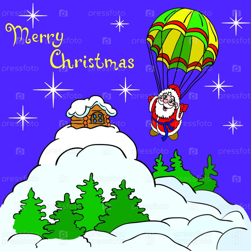 Веселый Санта Клаус спускается с неба на парашюте