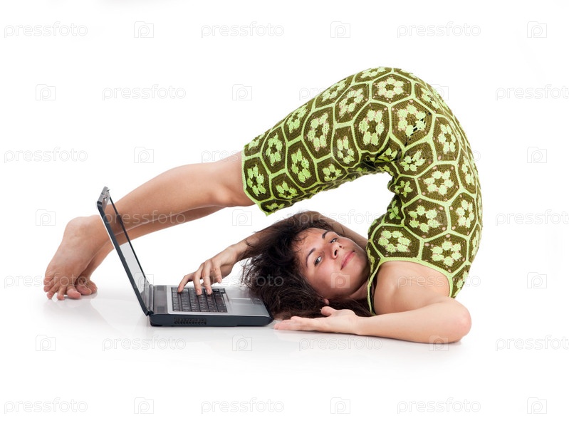 Гибкая девушка с ноутбуком на белом фоне