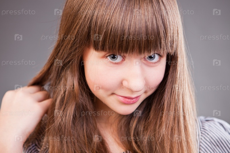 Портрет молодой симпатичной девушки на сером фоне