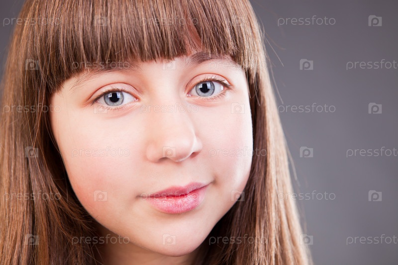 Портрет молодой симпатичной девушки на сером фоне