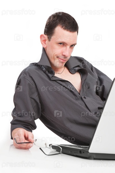 Портрет молодого человека с ноутбуком на белом фоне