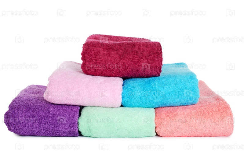 Стопка разноцветных полотенец на белом фоне