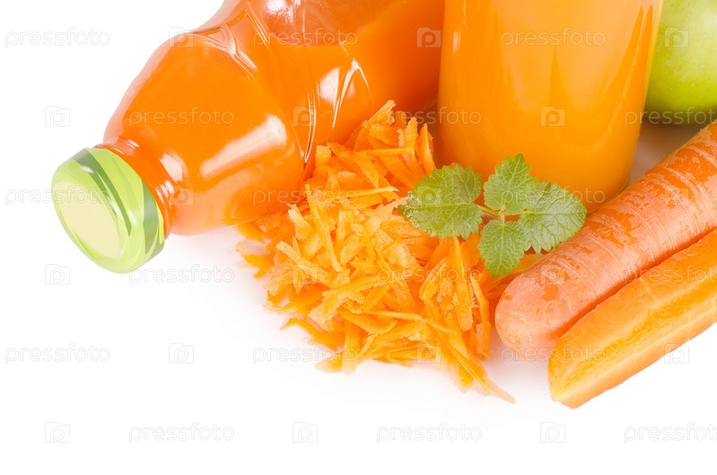 Чищенная морковка и банки с морковным соком на белом фоне