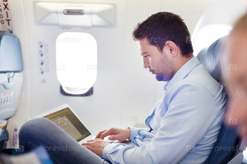 Бизнесмен в самолете работает за ноутбуком