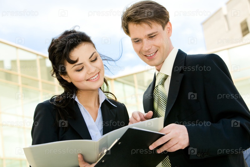 Портрет привлекательных бизнесменов, обсуждающих план на встрече на улице