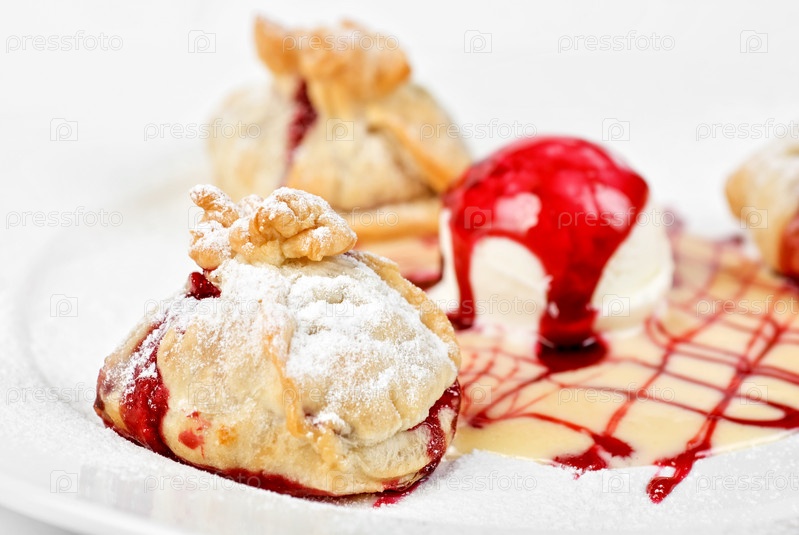 Пирожное, мороженое и соус на тарелке