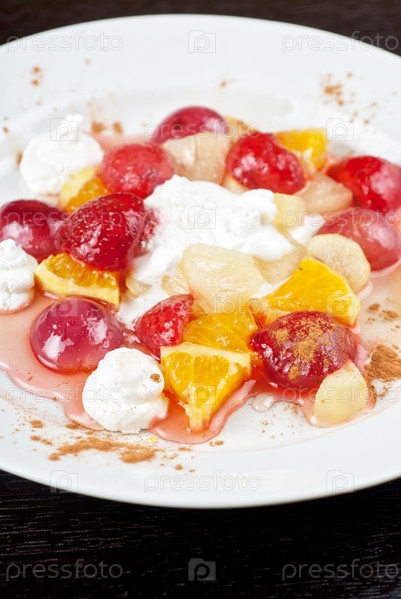 Фруктовый салат из ананаса, винограда, апельсина и клубники со взбитыми сливками