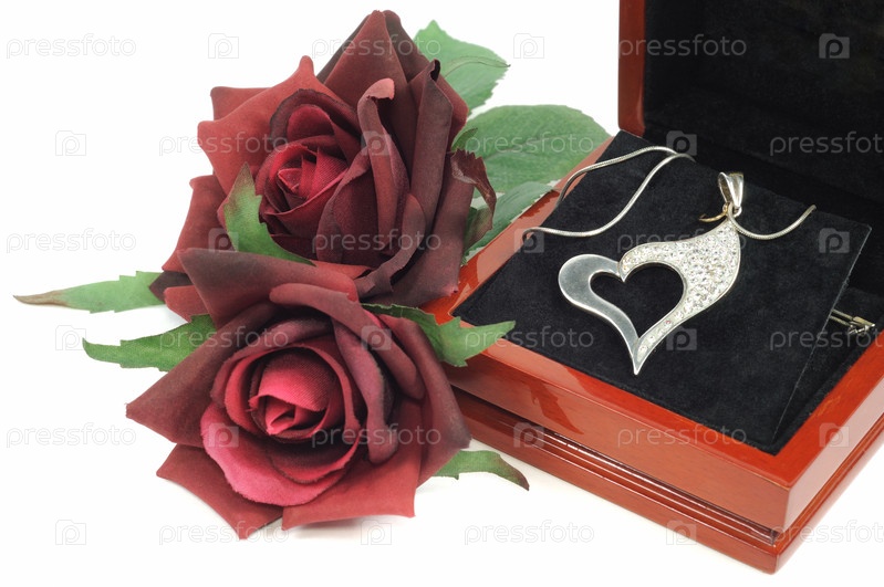 Платиновое сердца в коробочке и красные розы