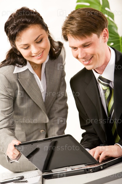 Портрет двух деловых партнеров, которые смотрят на монитор ноутбука и обсуждают новый проект