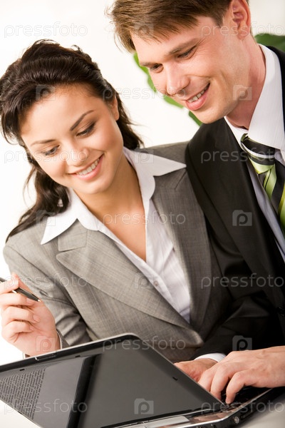 Вертикальное изображение бизнесмена и предпринимательницы, которые вместе работают над компьютером