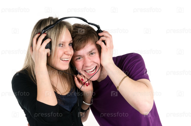Молодая пара слушает музыку в наушниках