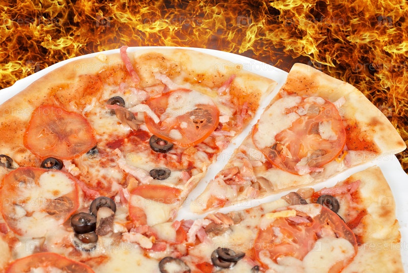 Аппетитная пицца крупным планом на огненном фоне