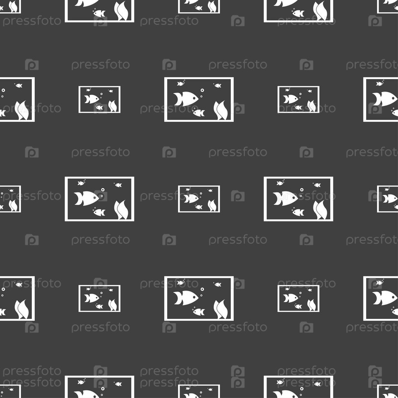Аквариумы, рыбы в воде. Бесшовный узор на сером фоне. Вектор