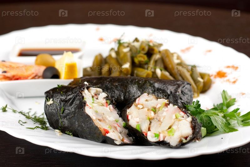 Рулет из морепродуктов крупным планом