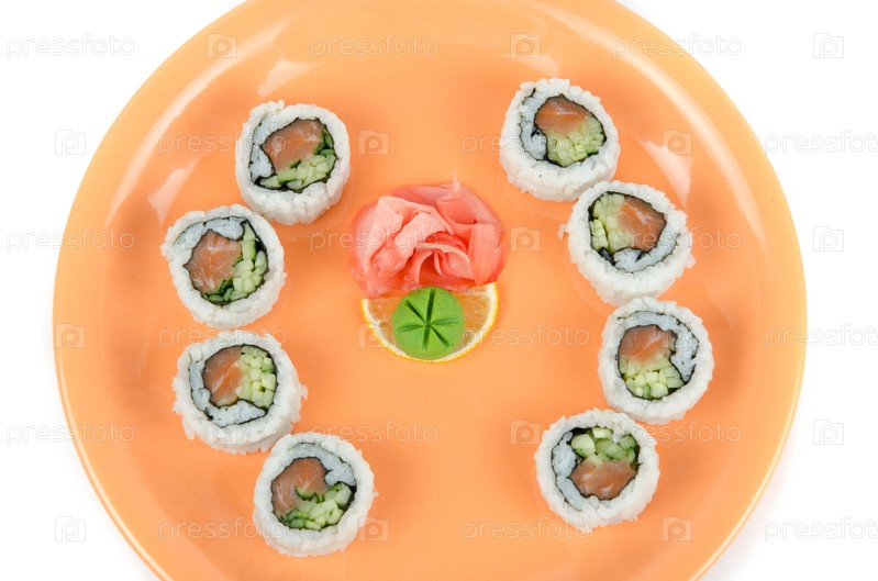 Японские суши на тарелке на белом фоне