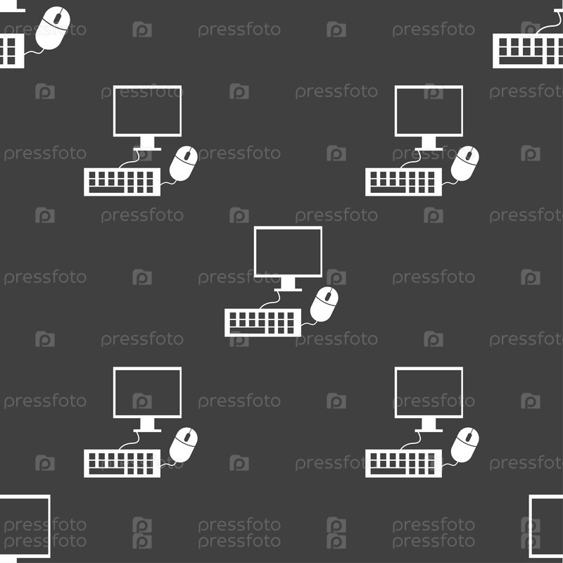 Широкоформатный монитор, клавиатура, мышь. Бесшовный узор на сером фоне. Вектор