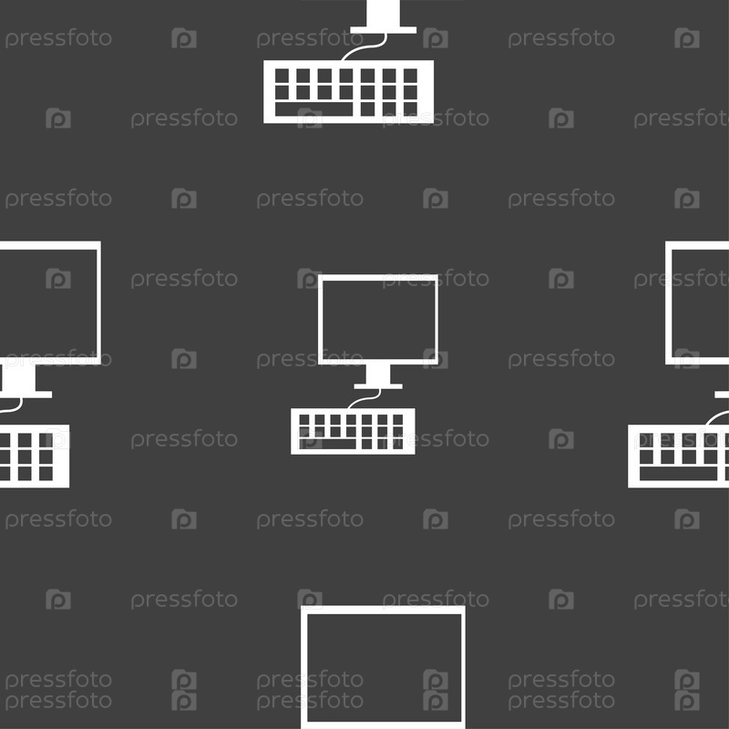 Монитор компьютера и клавиатуры значок. Бесшовный узор на сером фоне. Вектор