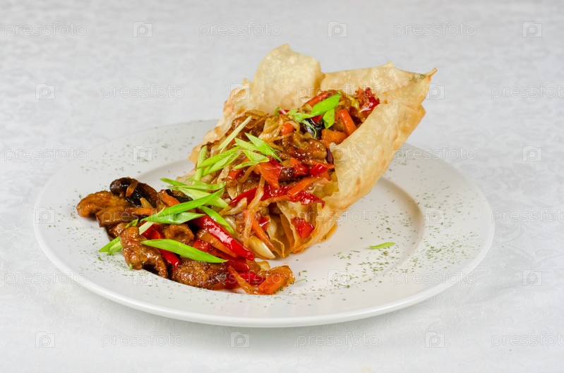 Жареная говядина с овощами в кисло-сладком соусе