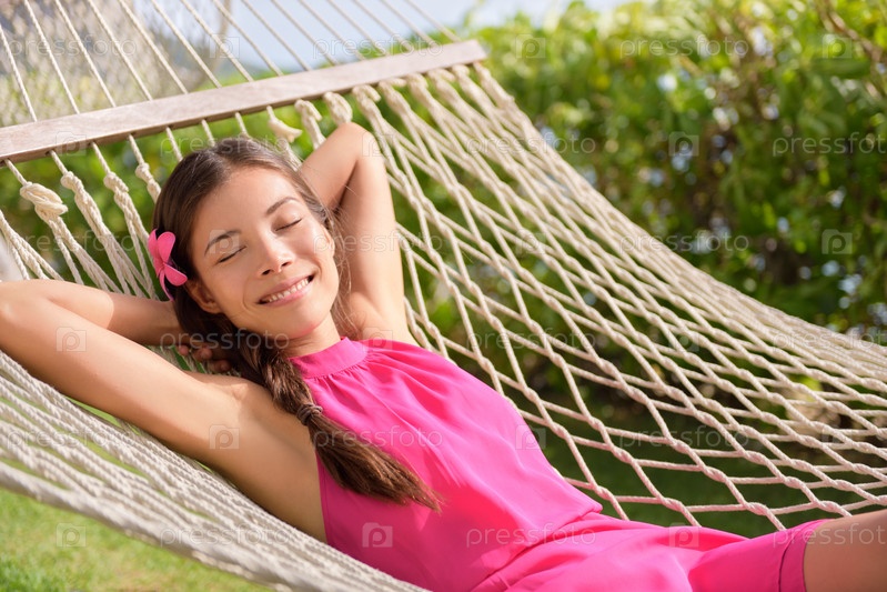 Счастливая девушка лежит в гамаке