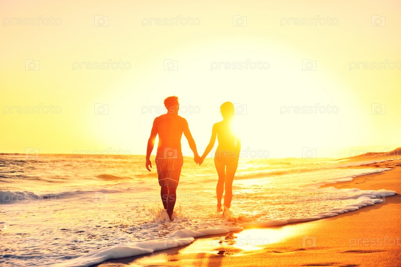 Влюбленная пара гуляет по берегу на закате