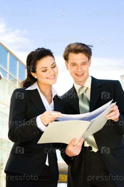 Изображение счастливого бизнесмена и деловой женщины, держащих документы снаружи