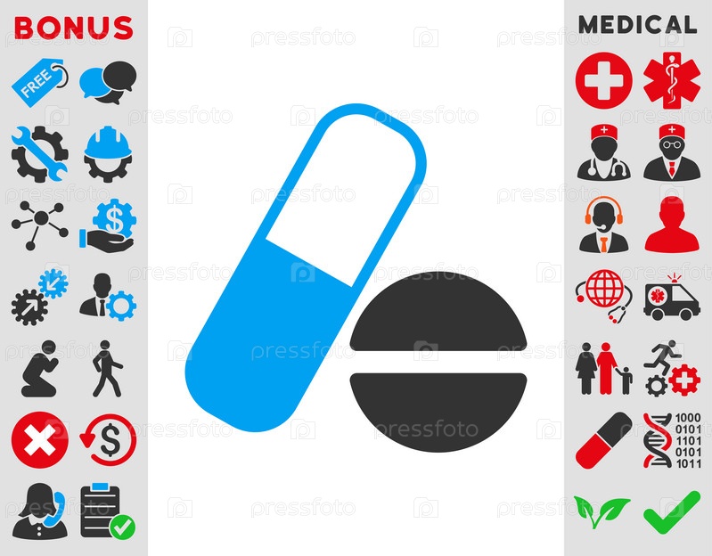 Лекарства иллюстрации значок. Стиль является биколор плоский символ, голубой и серый цвета, закругленные углы, белый фон