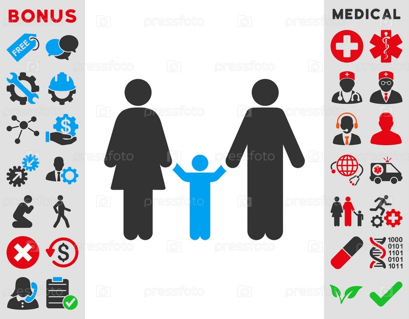 Родители и ребенок иллюстрации значок. Стиль является биколор плоский символ, голубой и серый цвета, закругленные углы, белый фон