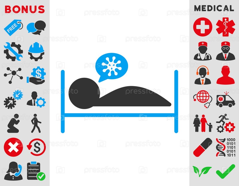 Пациент кровать иллюстрации значок. Стиль является биколор плоский символ, голубой и серый цвета, закругленные углы, белый фон