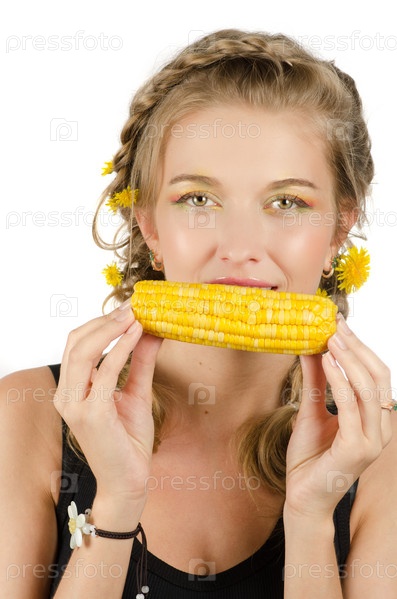 Красивая молодая девушка с кукурузой на белом фоне