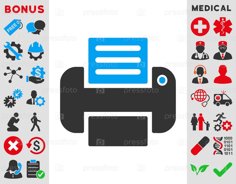 Значок печати иллюстрации. Стиль является биколор плоский символ, голубой и серый цвета, закругленные углы, белый фон