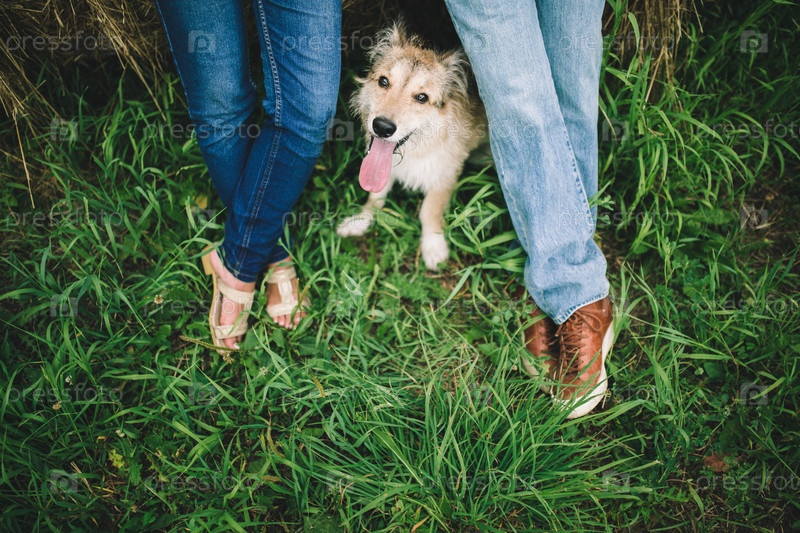 Собака и пара на зеленой траве