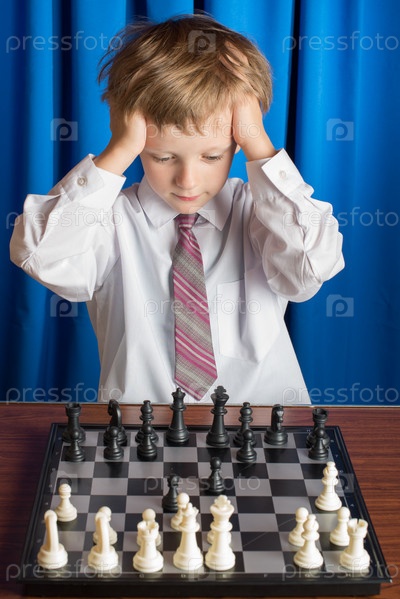Маленький мальчик в белой рубашке играет в шахматы