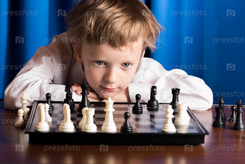 Маленький мальчик в белой рубашке играет в шахматы