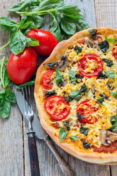 Пицца с грибами, помидорами и базиликом