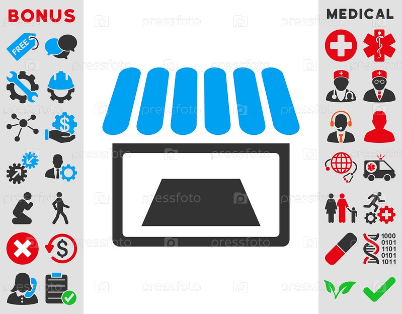Магазин иллюстрации значок. Стиль является биколор плоский символ, голубой и серый цвета, закругленные углы, белый фон