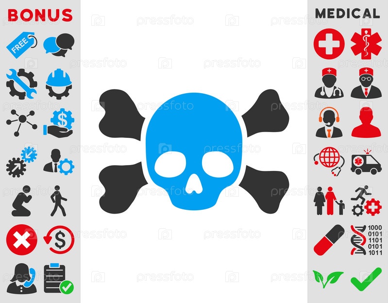 Череп и кости иллюстрации значок. Стиль является биколор плоский символ, голубой и серый цвета, закругленные углы, белый фон