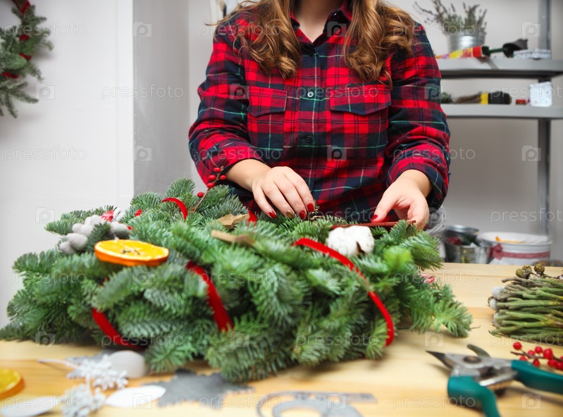 Девушка украшает Рождественский венок