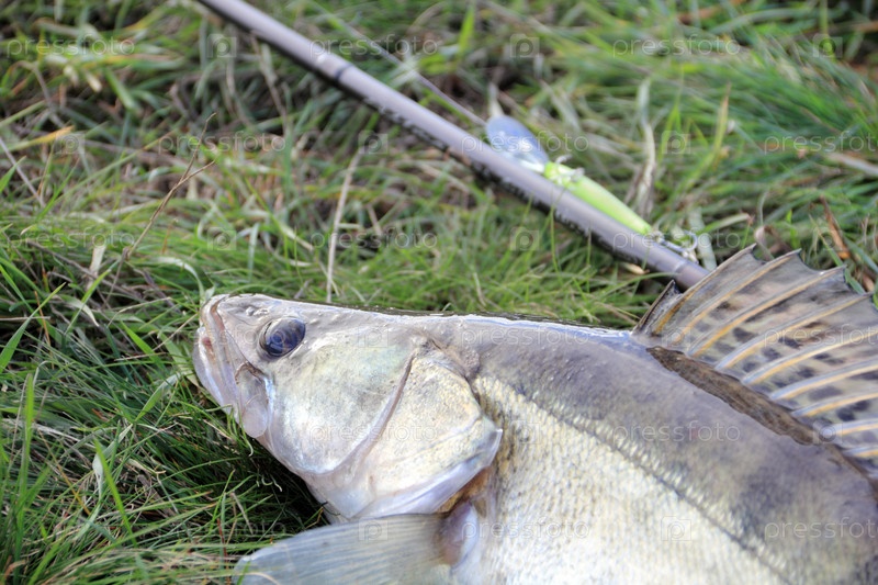 Пойманная рыба и удочка на траве