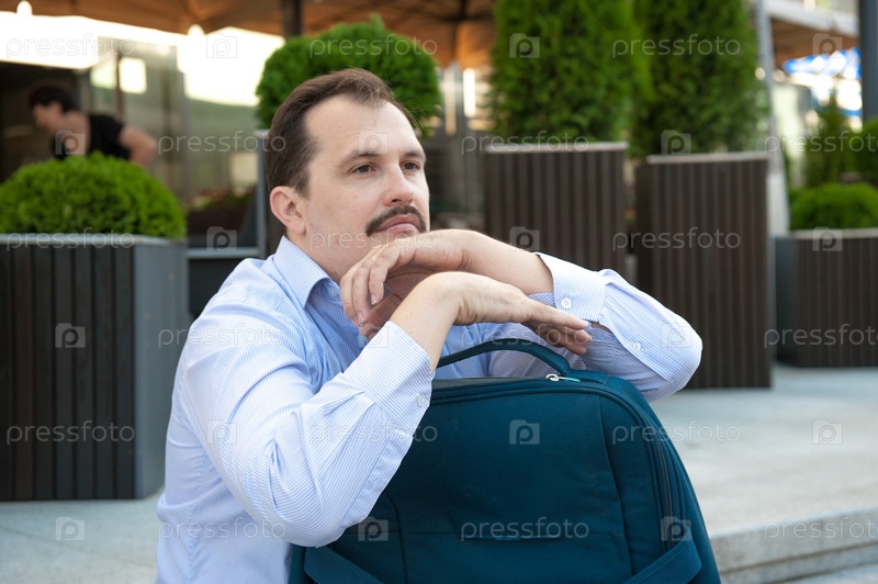 Мужчина сидит с рюкзаком на лесенках