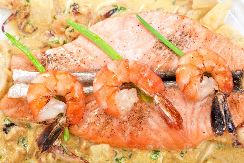 Блюдо из лосося и креветок крупным планом