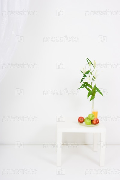 Яблоки, стакан сока и лилий на столе в комнате с ярким освещением