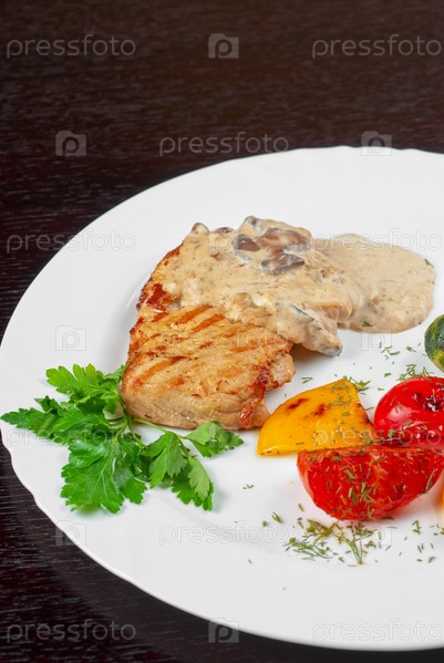 Стейк из свинины с грибным соусом и овощами
