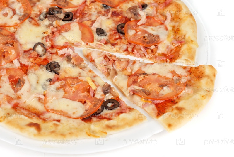 Пицца с ветчиной, помидорами и оливками на тарелке