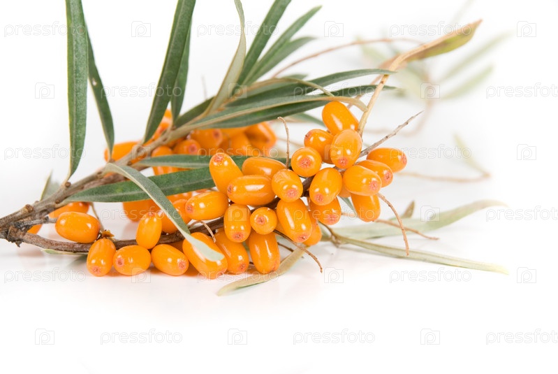 Ветка зрелых оранжевых ягод облепихи с листьями на белом фоне