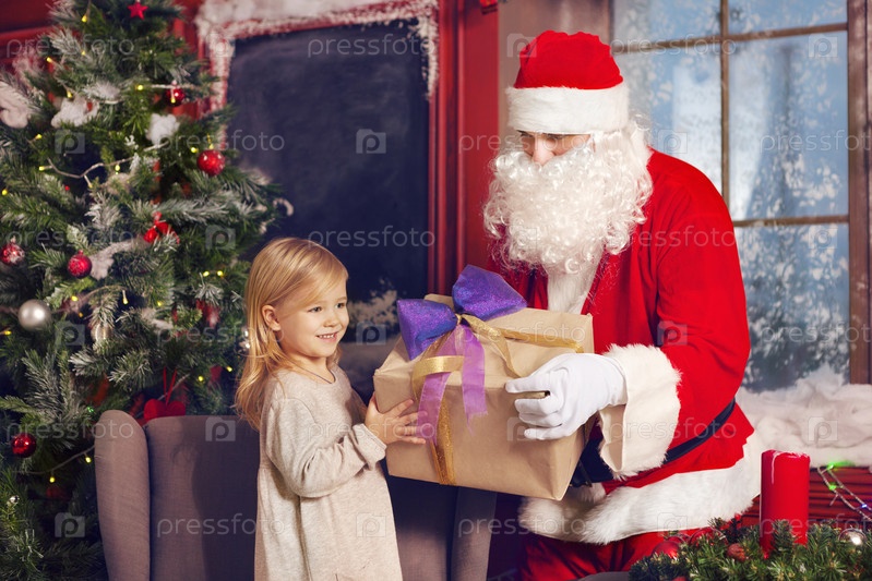 Улыбаясь маленькая девочка с Санта-Клауса и подарки